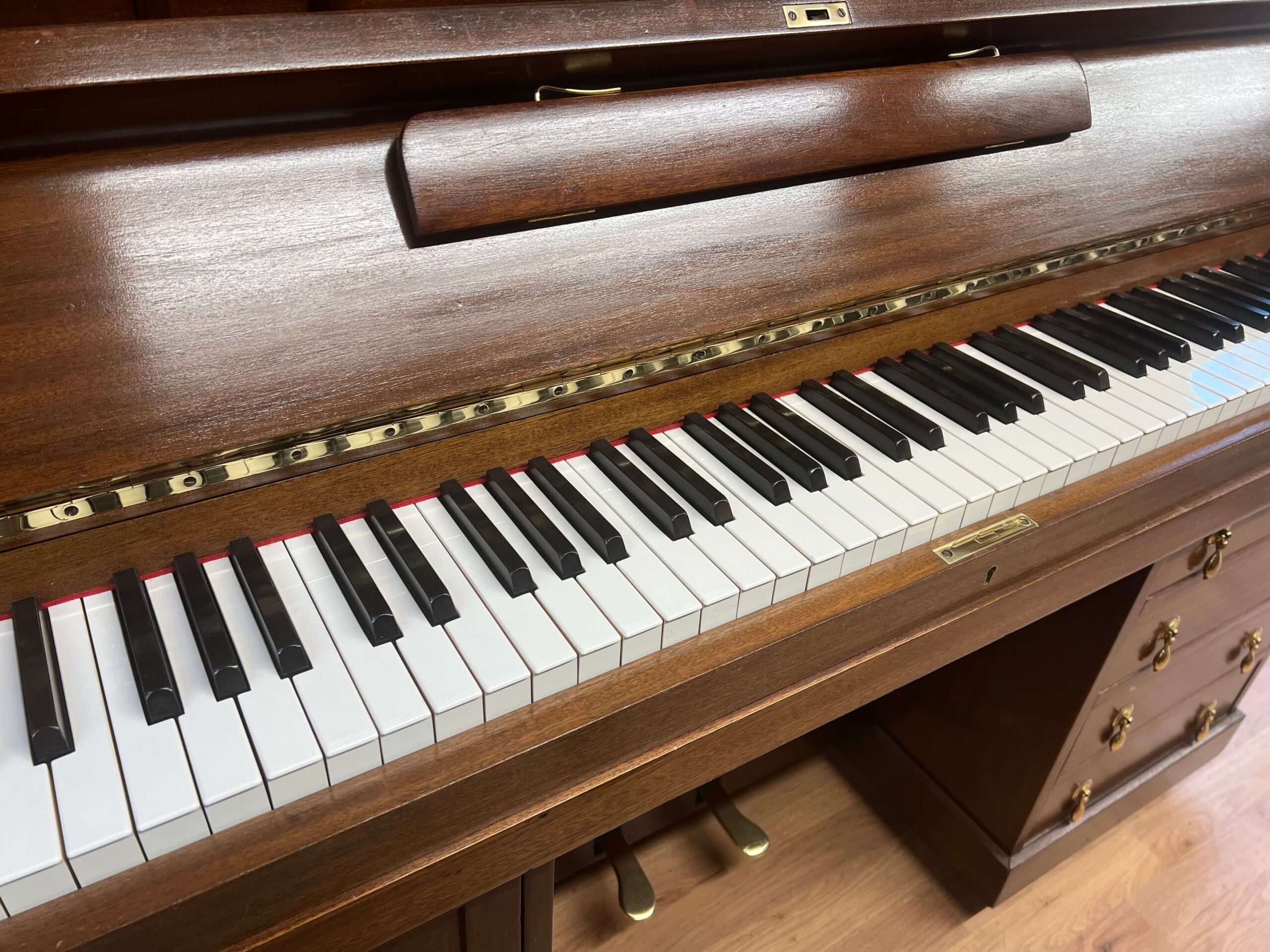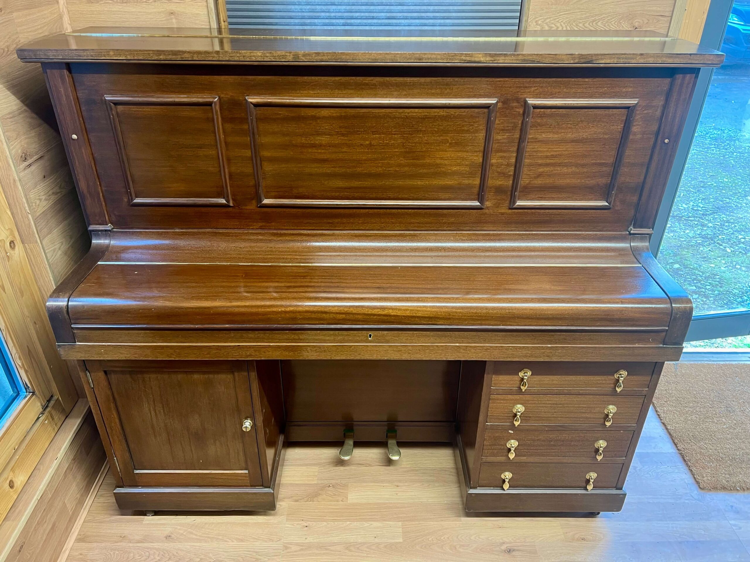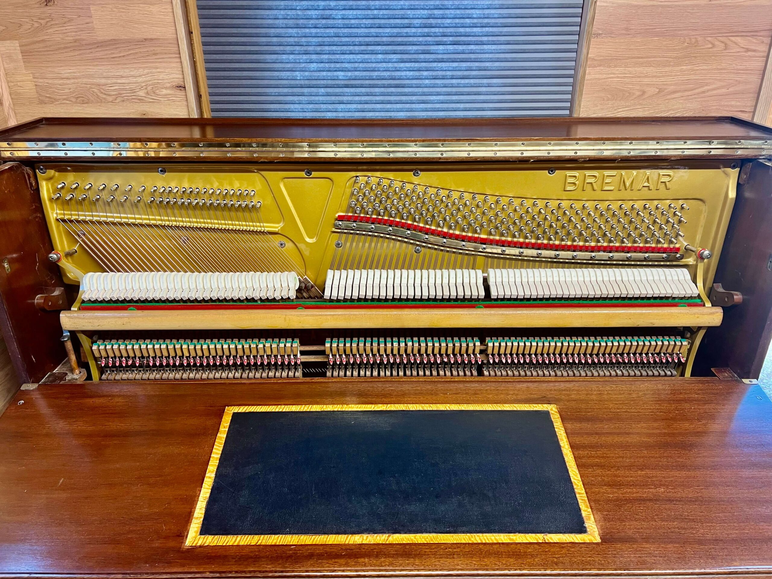 Here we have a Bremar ‘Desk Piano’ built in mahogany, Made in England.